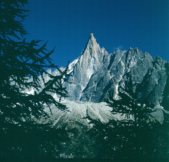 bildet den Blickfang für ein Herbstbild 1997: Die Aiguille du Dru mit dem typisch bizarren,