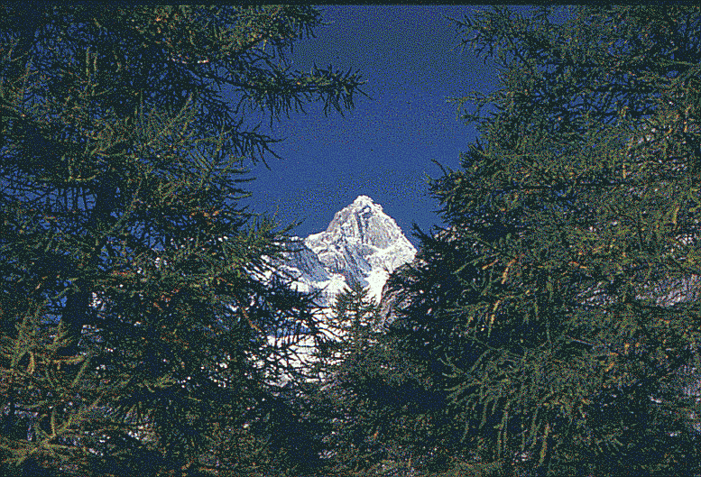 zwischen den Lärchen leuchtet immer irgendwo eine Berggestalt