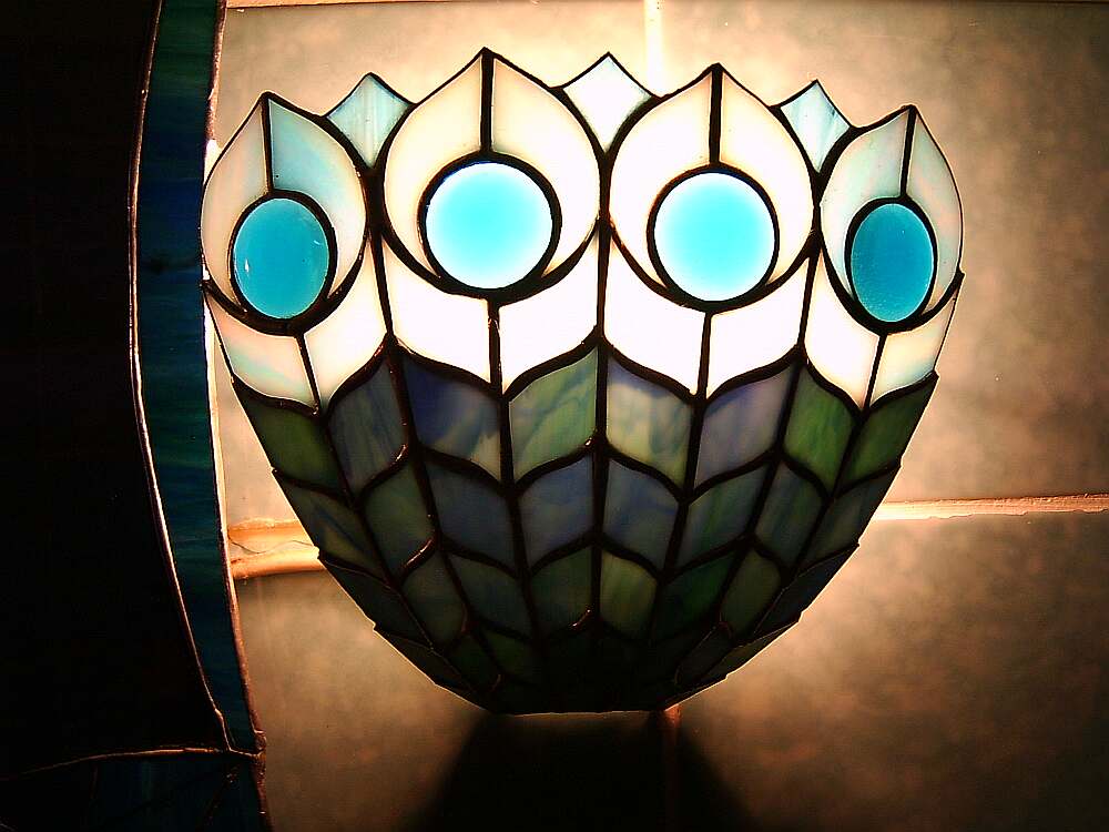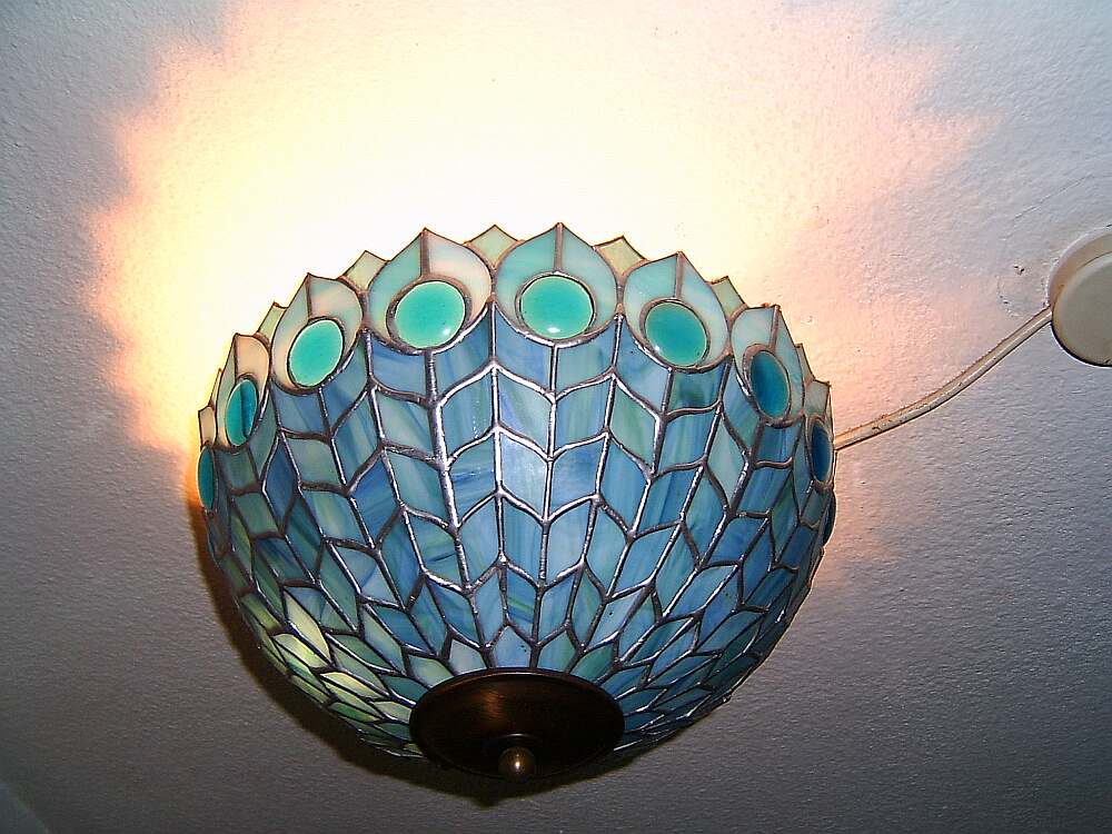 | Name: Pfauenfeder II Durchmesser: 30 Höhe: 15/- 3 verschiedene Gläser, Glaslinsen; hier als ausleuchtende Wandlampe und als Deckenlampe Glasteileanzahl: <64/192 Verwendung ähnlich wie vor |