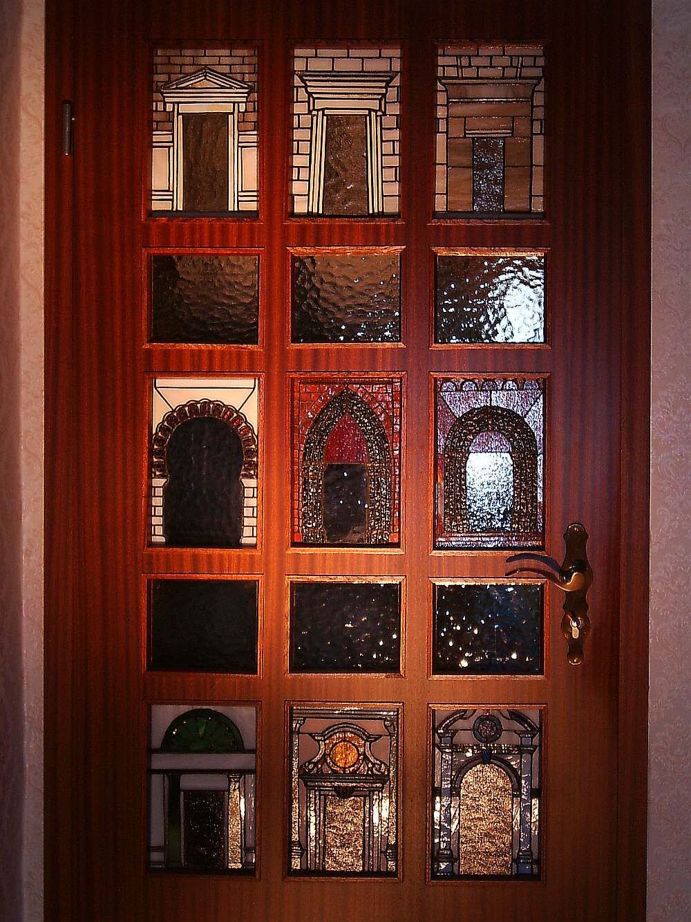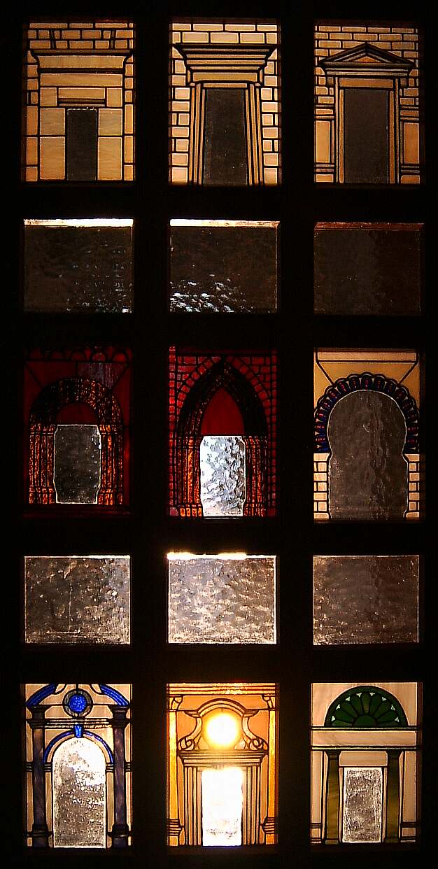 | Name: Portale (Eigenentwurf nach einem Kunstbuch) Maße der Glasflächen: 9x17x26 und 6x17x14 mehr als 10 verschiedene Gläser Glasteileanzahl: ca. 772 Die Tür, der man zuerst begegnet, durch die alle gehen, die willkommen heißen soll. Portalausführungen aus vielen Jahrhunderten Kunstgeschichte: Von Ägypten zum Klassizismus. Nicht einfach nur als ebene Flächen realisiert, sondern als mehrfach gestaffelte Reliefs, also die Konturen in mehreren Ebenen aufgebaut, was man in diesen Bildern kaum sieht. Nicht nur deswegen ein Objekt, das man in Natur sehen sollte..... Die Tür, die einen Gegenpol im gleichen Raum herausfordern darf: Das unter Die Tür beschriebene Kunst-Abenteuer. Kunstgeschichte, dargeboten in Glasreliefs und die Faszination der Kassette! |