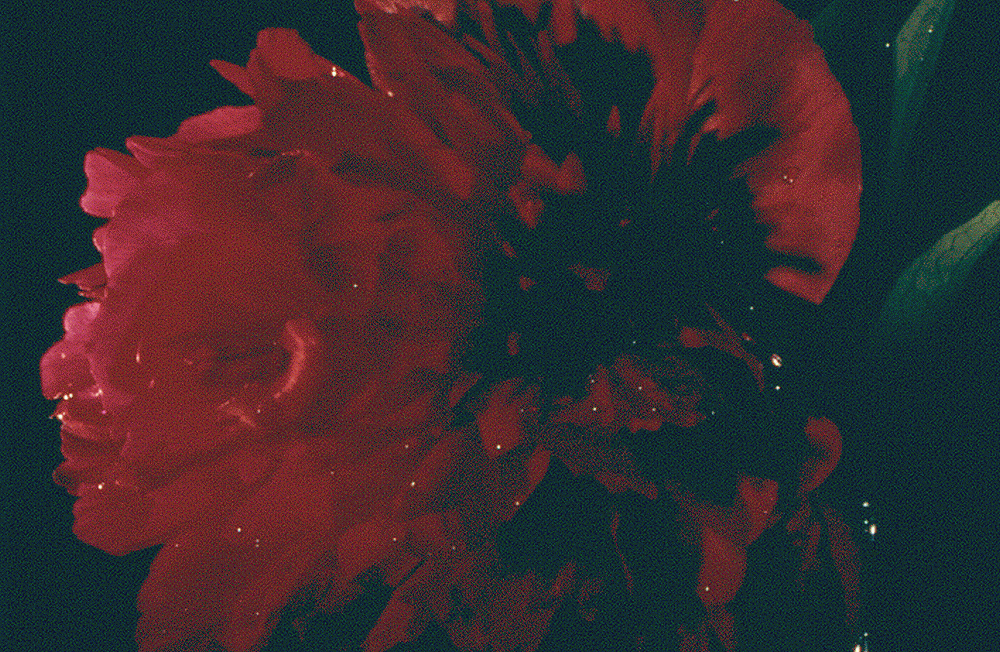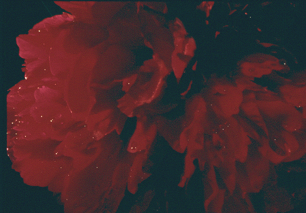 die Bilder beidseitig ein, im unteren Bereich links eine rote Rose, zentrisch zwei Teile
