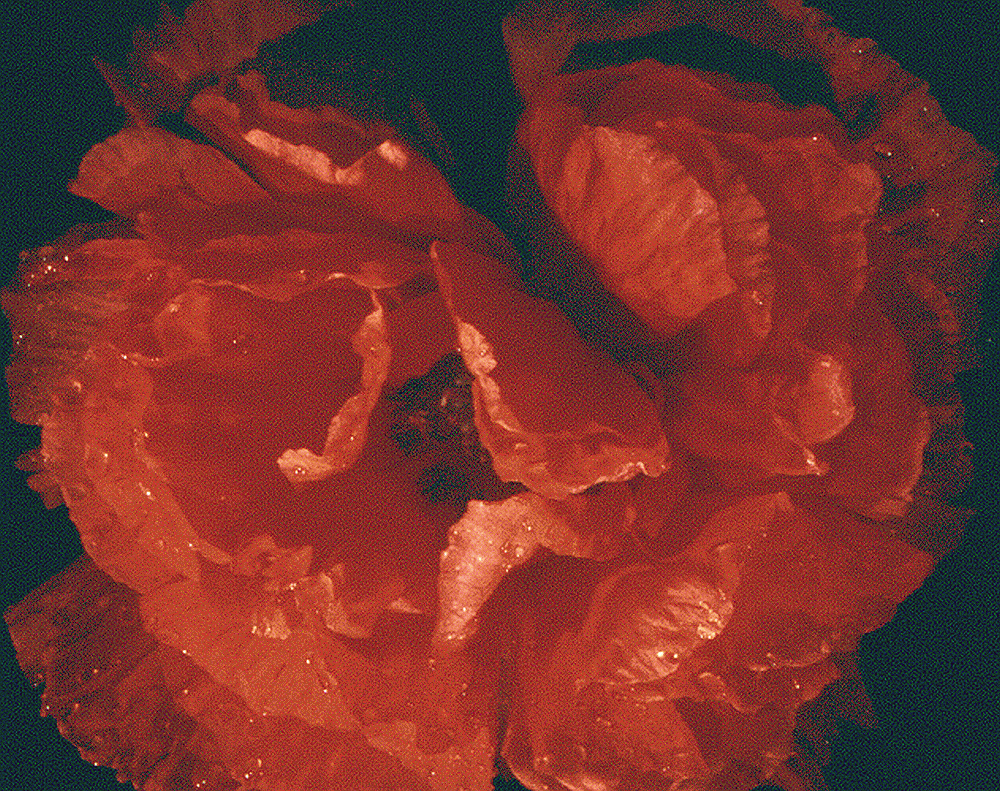 In den Eckbereichen des verzierten, vergoldeten Rahmens je eine getrocknete, rote