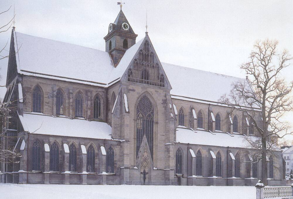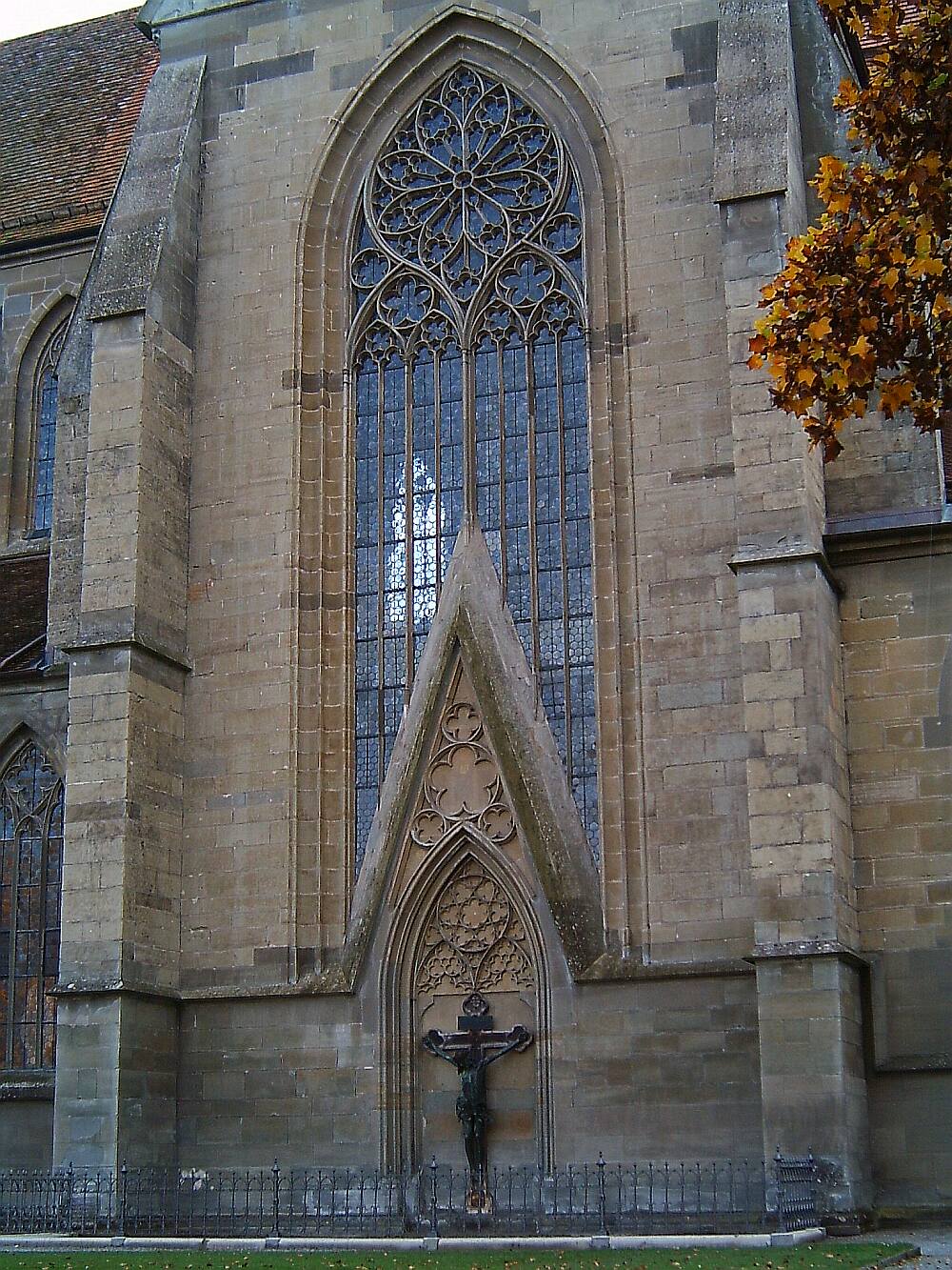 Außen ein großes, gotisches Langhaus mit Dachreiter;