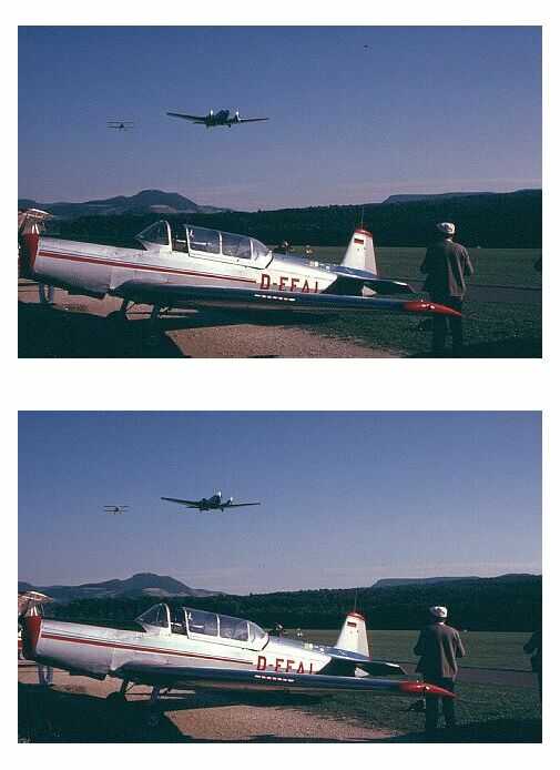 Jungmeister?), einem Doppeldecker. Im Vordergrund eine Zlin? Im Hintergrund die Teck