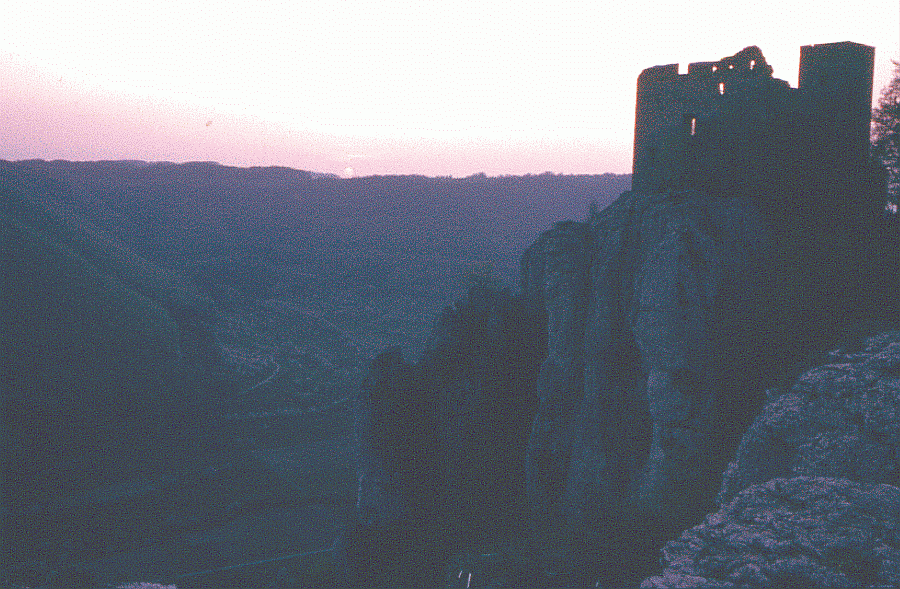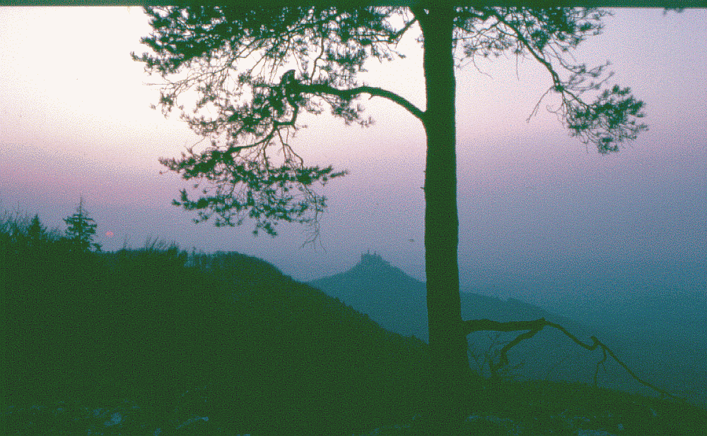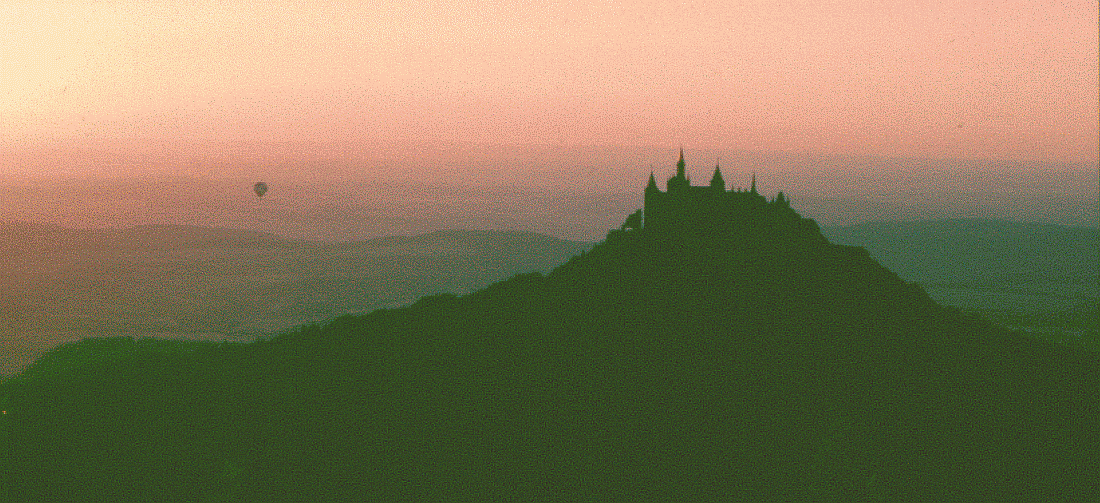 roter Sonnenuntergang, das Traumschloß der Alb, ähnlich Neuschwanstein, nur größer: